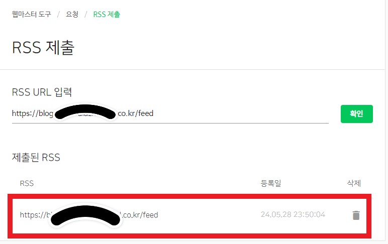 - 사이트 관리-->> 요청-->>RSS제출-->>주소복사 후 Feed를 작성 후 확인을 누릅니다.
