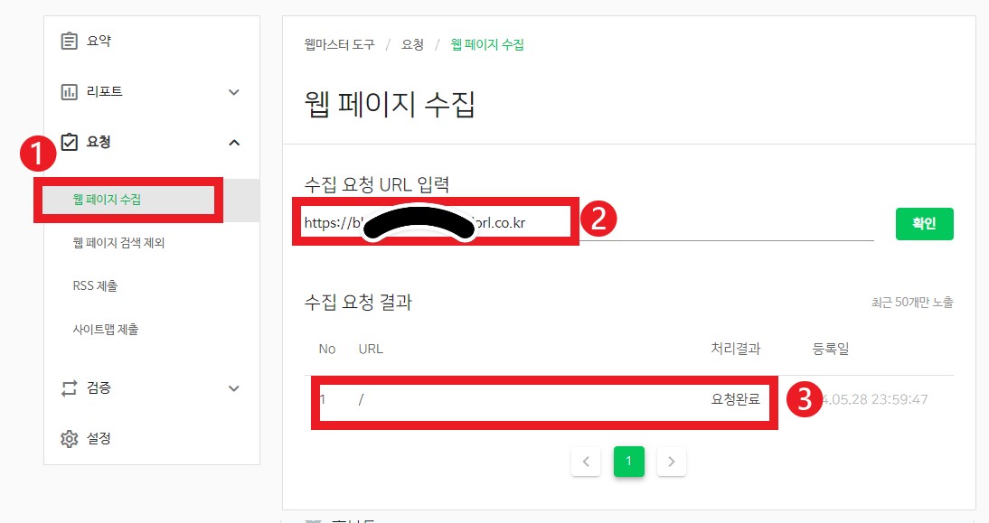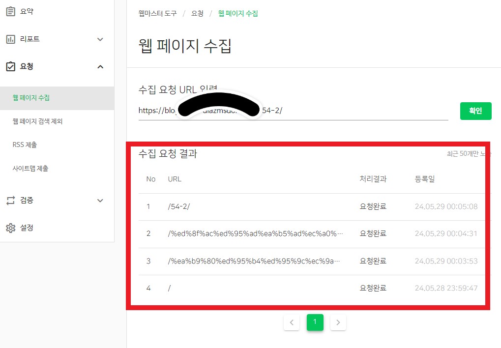 - 웹페이지 수집에 그날 포스팅한 글 주소를 복사해서 붙여주고 확인을 눌러줍니다