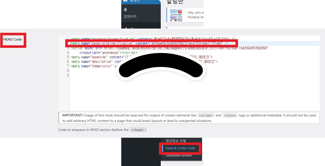 - 다시 워드프레스로 돌아와서 도구-->>head&Footer code에 들어갑니다