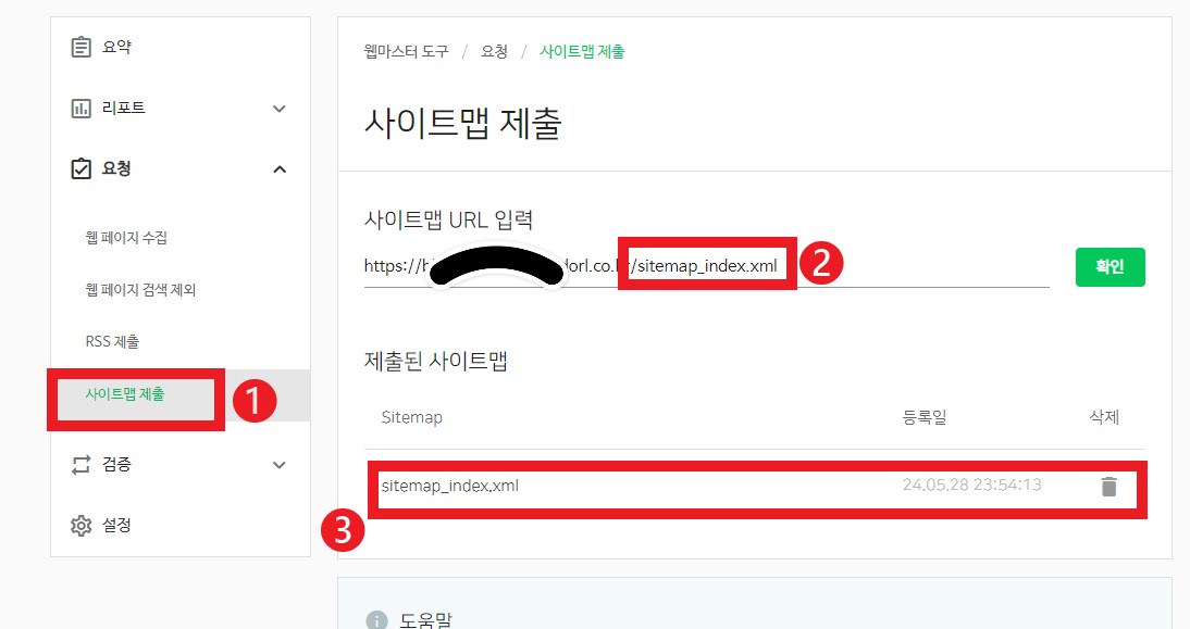 - 사이트맵 제출로 들어가서 사이트주소를 적어준 뒤 아래처럼 sitemap_index.xml를 작성해서 확인을 누릅니다